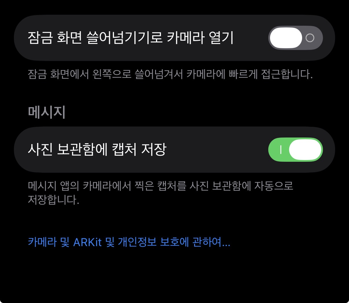 이렇게 '잠금 화면 쓸어넘기기로 카메라 열기'가 있다.