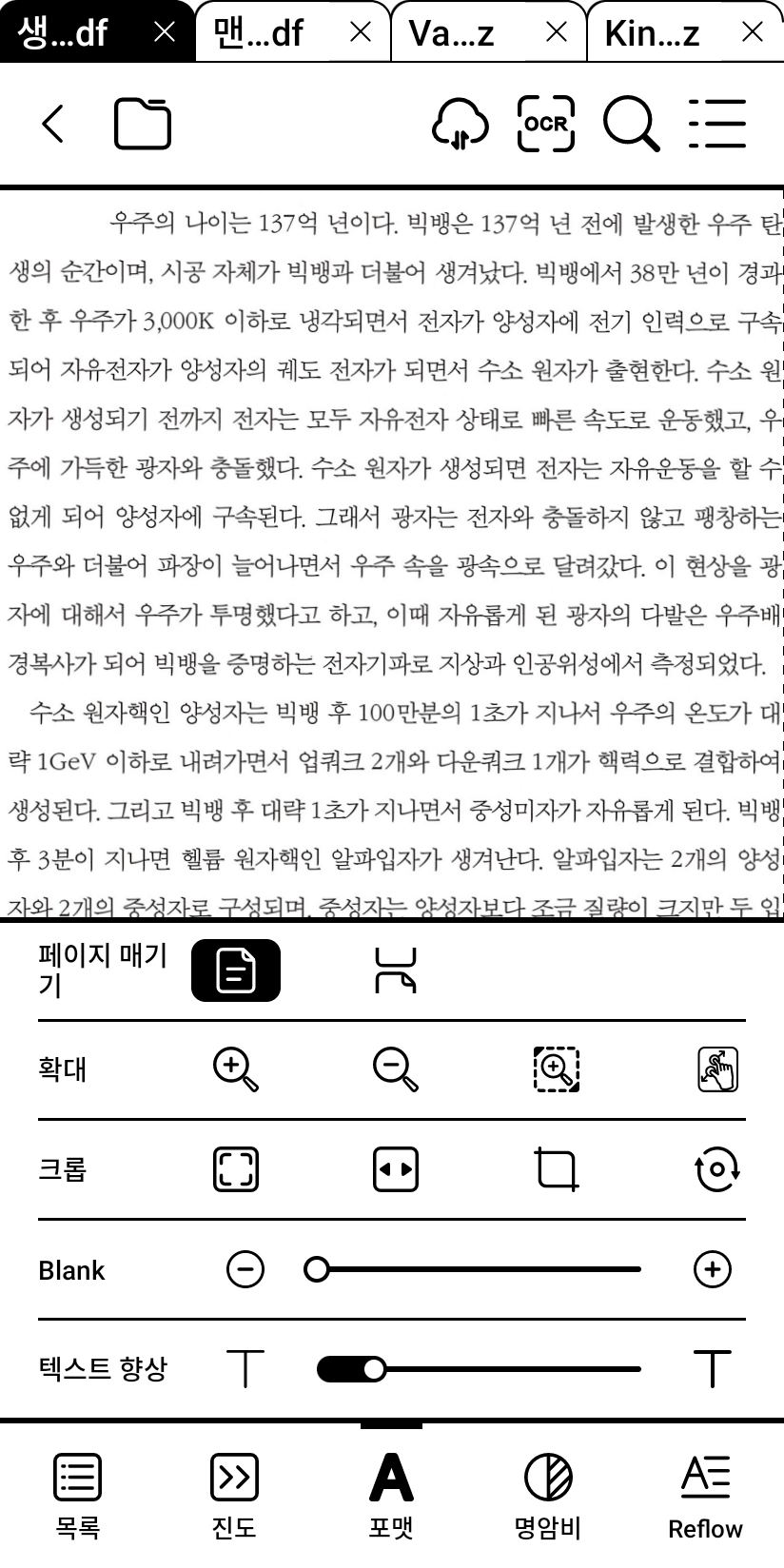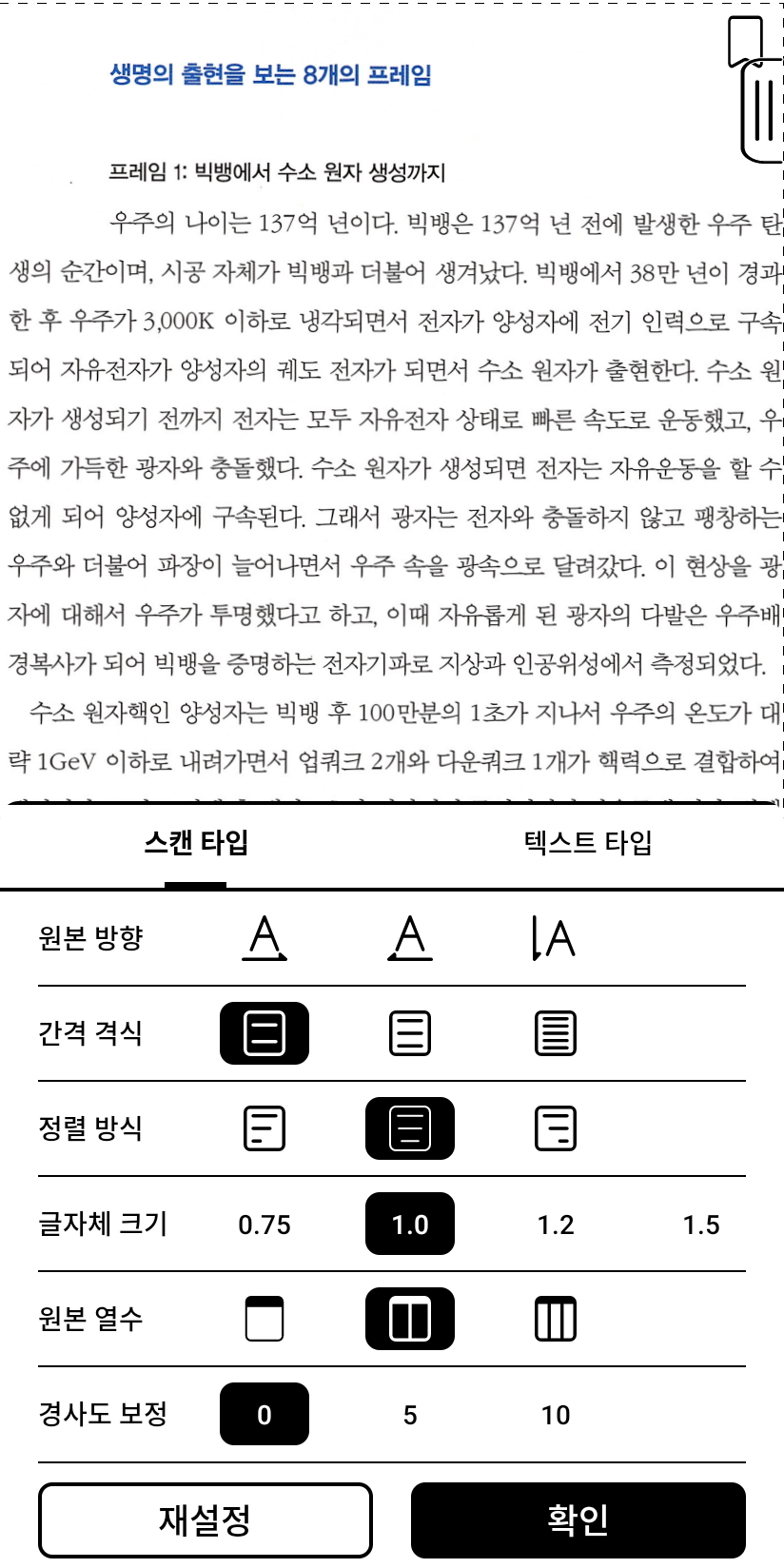 스캔본도 책을 열면 OCR이 동작한다. 이 OCR을 기반으로 글씨 크기로 스캔된 이미지의 위치를 가져와서 키우고 재구성해주는 기능 같은데 이게 생각보다 쩐다.