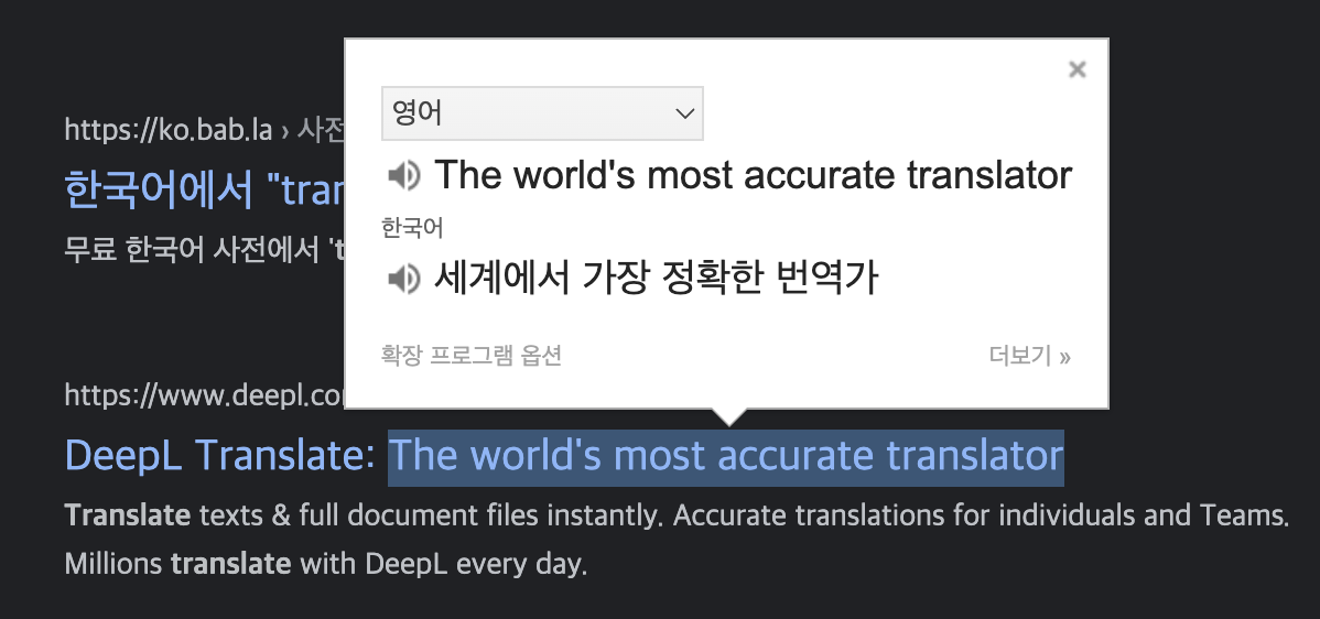 필자는 크롬 확장 프로그램으로 '구글 번역' 을 사용하고 있다.
